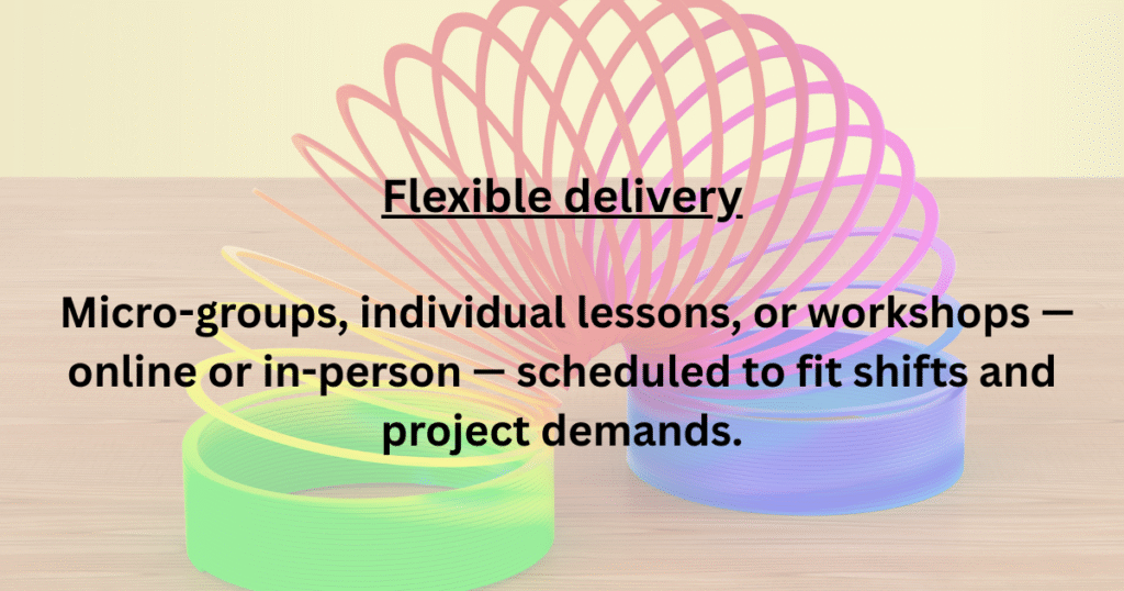 Available online or in person, all programs are led by experienced, certified tutors and professors (including British and American native speakers) and tailored to real-world business communication. We offer two clear, effective paths with different training options – each focused on real workplace situations, giving employees practical skills they can immediately apply to drive business performance.